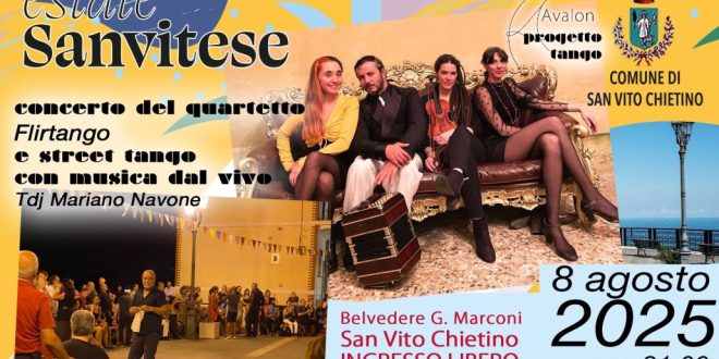 Nell’ambito dell’estate Sanvitese 2025 Avalon Progetto Tango in collaborazione e con il sostegno del Comune di San Vito Chietino, l’8 agosto dalle ore 21.00 invita a partecipare ad una serata al Colle tutta dedicata al tango e non solo, con musica dal vivo e ballo nella meravigliosa cornice del Belvedere …