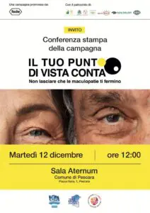 Martedì 12 Dicembre alle ore 12, nella Sala Aternum del Comune di Pescara (Piazza Italia 1), la conferenza stampa di presentazione della Campagna di prevenzione “Il tuo punto di vista conta – Non lasciare che le maculopatie ti fermino” organizzata dalla Scuola di Specializzazione in Oftalmologia dell’Università d’Annunzio di Chieti-Pescara, diretta dal professor Rodolfo Mastropasqua, in collaborazione con l’Unità operativa complessa di Oculistica della Asl di Pescara, diretta dal dottor Michele Marullo. L’iniziativa di grande rilevanza sociale e sanitaria è promossa da Roche, una delle principali multinazionali del settore farmaceutica, diagnostica e biotecnologia, e prevede uno screening gratuito ad ampio raggio sulle maculopatie che colpiscono circa il 12% della popolazione con più di 70 anni, portando gravissime conseguenze per la vista. Diagnosi precoce e tecnologia risultano fondamentali. Parteciperanno Rodolfo Mastropasqua – Professore ordinario in Oftalmologia, Direttore della Scuola di Specializzazione in Oftalmologia, Università d’Annunzio Chieti-Pescara, Michele Marullo – Direttore dell’Unità operativa complessa di Oculistica, Asl Pescara e Massimo Ligustro – Presidente Comitato Macula.
