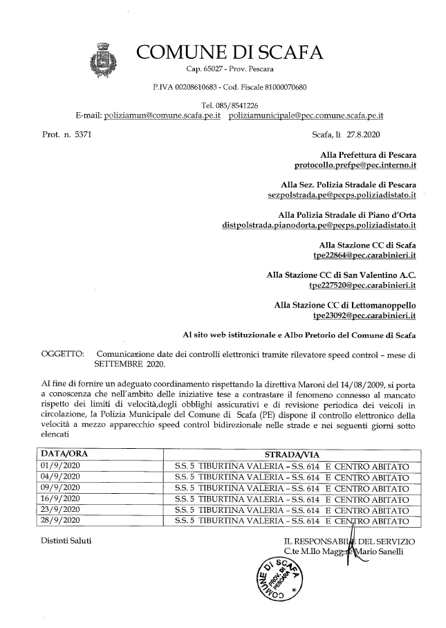 Dal Comune di Scafa la comunicazione delle date dei controlli elettronici tramite rilevatore speed control per il mese di SETTEMBRE 2020. Ecco il calendario: