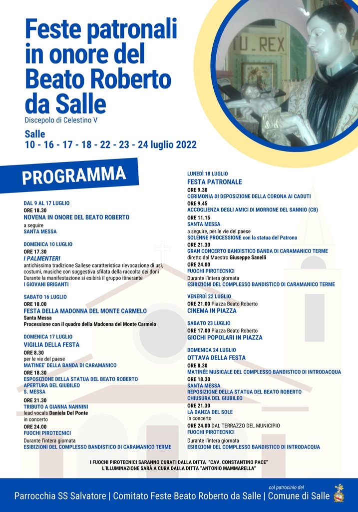 Il Beato Roberto, santo patrono del paese nacque a Salle nel 1273. Da giovanissimo scelse la via della vita monastica con l’ordine dei celestiniani di Pietro da Morrone, di cui divenne allievo prediletto. Nel 1294 Roberto, allora giovanissimo, fu successore del suo maestro quando venne eletto Papa con il nome di Celestino V. Divenuto poi priore della Badia di Santo Spirito a Maiella, cominciò la sua vita erigendo monasteri e centri di preghiera. Nel 1331 si ritirò nel monastero di Morrone del Sannio (Campobasso), dove morì il 18 luglio 1341. L’anno dopo l’urna contenente il suo corpo venne trasferita all’eremo di Sant’Onofrio, a Sulmona. Nel 1807 le reliquie furono traslate nella parrocchia del Santissimo Salvatore a Salle, dove sono continuo oggetto di venerazione.