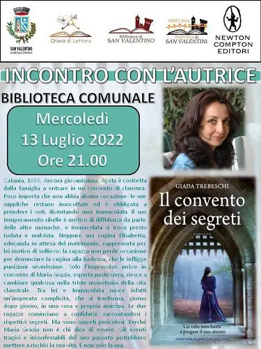 Si parte mercoledì 13 luglio alle ore 21.00 con la presentazione del libro “IL CONVENTO DEI SEGRETI” di Giada Trebeschi“Catania, 1669. Ancora giovanissima, Agata è costretta dalla famiglia a entrare in un convento di clausura. Poco importa che non abbia alcuna vocazione: le sue suppliche restano inascoltate ed è obbligata a prendere i voti, diventando suor Immacolata. Il suo temperamento ribelle è motivo di diffidenza da parte delle altre monache, e Immacolata si trova presto isolata e malvista. Neppure sua cugina Elisabetta, educanda in attesa del matrimonio, rappresenta per lei motivo di sollievo: la ragazza non perde occasione per denunciare la cugina alla badessa, che le infligge punizioni severissime. Solo l’improvviso arrivo in convento di Maria Grazia, esperta pasticciera, riesce a cambiare qualcosa nella triste monotonia della vita claustrale. Tra lei e Immacolata nasce infatti un’insperata complicità, che si trasforma, giorno dopo giorno, in una vera e propria amicizia. Le due ragazze cominciano a confidarsi, raccontandosi i rispettivi segreti. Ma sono segreti pericolosi. Perché Maria Grazia non è chi dice di essere. Gli eventi tragici e inconfessabili del suo passato potrebbero mettere a rischio la sua vita. E non solo la sua”