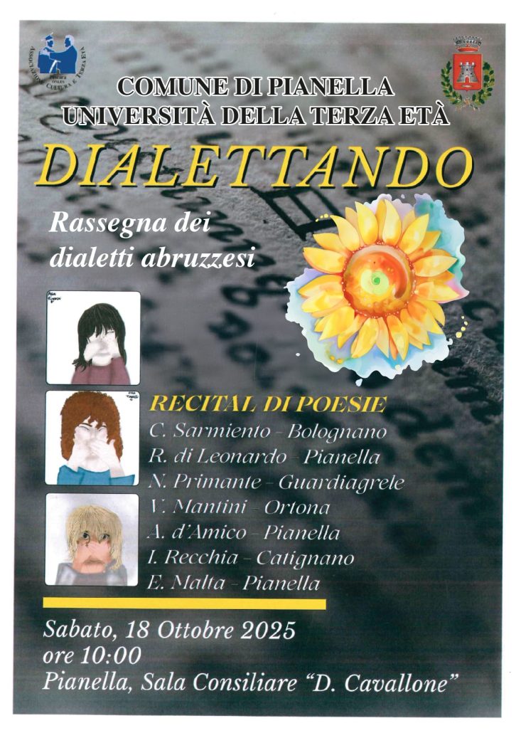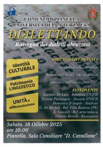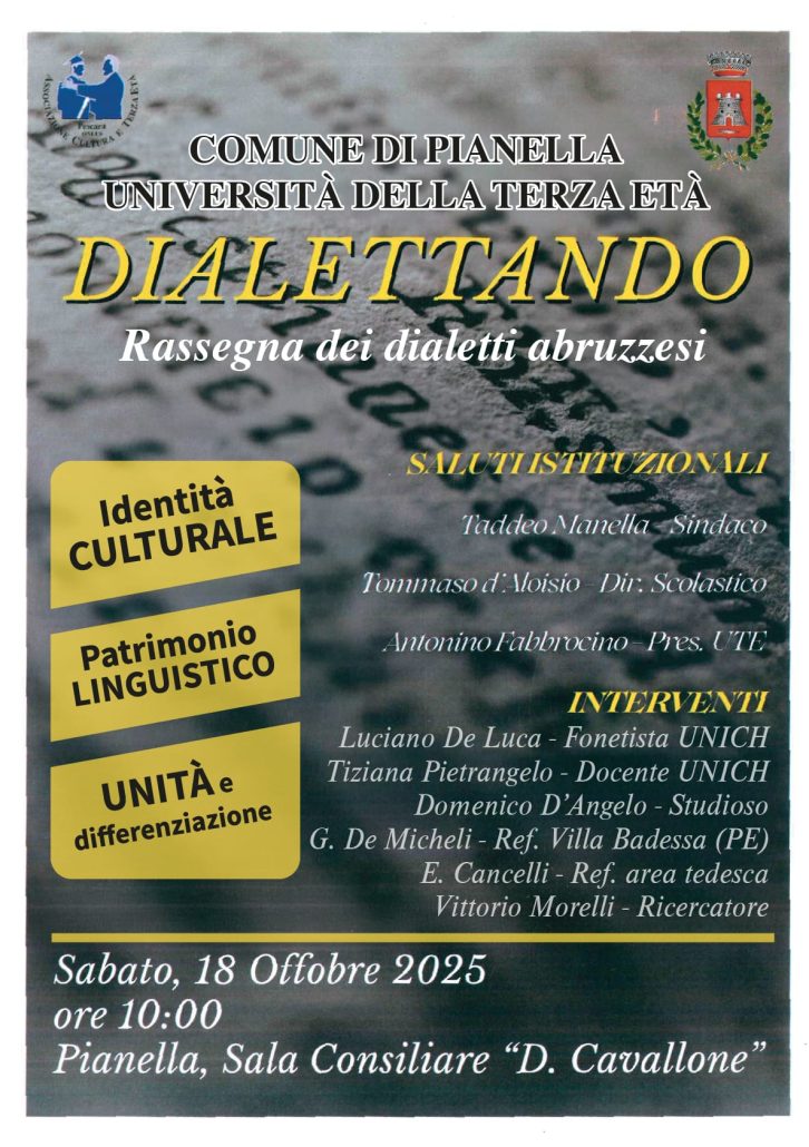 Sabato 18 Ottobre, ore 10,00, a Pianella, presso la Sala Consiliare, si svolgerà il Convegno: Rassegna dei dialetti abruzzesi, prospettive future. Interverranno il prof. Luciano de Luca (Unich): Gli Organi di fonazione e la formazione delle lingue; la prof. Tiziana Pietrangelo (Unich), II viaggio del gusto attraverso il ricettario della bisnonna; Antonio Di Marco (Presidente del Premio “Maiella), I borghi più belli d’Italia e i dialetti; il prof. Vittorio Morelli (ricercatore), Le aree linguistiche abruzzesi e la loro sopravvivenza; il prof. Domenico D’Angelo, (da Busto Arsizio), La koiné di Frisa (Ch); Beppe de Micheli, L’isola alloglotta di Villa Badessa; Emma Cancelli, Influenze del tedesco antico sulle parlate dialettali. Recital di poesia dei poeti Ireneo Recchia, Claudio Sarmiento, Vinia Mantini, Elena Malta, Antonio d’Amico, Remo di Leonardo, Nicola Primante.