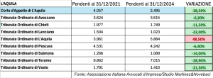 Tra il 2021 e il 2024 i tribunali abruzzesi hanno registrato una riduzione complessiva delle cause civili pendenti, con una media regionale in linea con il trend nazionale. Lo evidenzia un’analisi dell’Associazione Italiana Avvocati d’Impresa, presieduta da Antonello Martinez, secondo cui su 140 tribunali italiani solo 17 hanno registrato un incremento dei procedimenti non ancora conclusi.