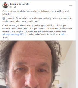 “Come in una grande orchestra, c’è bisogno dell’aiuto di tutti per onorare questa rara bellezza. E’ per questo che invitiamo tutti a votare Navelli come miglior borgo d’Italia all’interno della trasmissione #ilborgodeiborghi2022, condotta da Camila Raznovich su Rai3. Si può fare comodamente (dopo esservi registrati) a questo link: https://bit.ly/VotaperNavelli o su RaiPlay! Si vota fino a domenica 3 aprile alle ore 23.59, e solo votando si potrà dare a Navelli il riconoscimento che merita! (Si può votare una volta al giorno e per una sola preferenza)”, si legge sulla pagina facebook del Comune di Navelli. Navelli