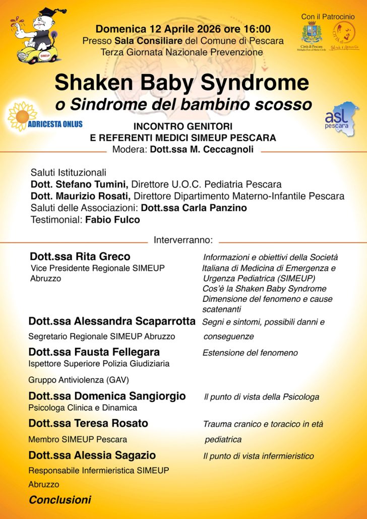 DDomenica 12 aprile 2026 alle ore 16 nella sala consiliare del Comune di Pescara si terrà un incontro dedicato alla Shaken Baby Syndrome, in occasione della giornata nazionale di prevenzione promossa dalla SIMEUP. L’iniziativa, patrocinata dal Comune e dalla Asl di Pescara e con l’adesione per il terzo anno consecutivo dell’associazione Adricesta Onlus, vedrà la partecipazione di medici, infermieri e referenti sanitari impegnati nell’informazione su una forma di maltrattamento infantile grave ma prevenibile. Testimonial dell’evento l’attore Fabio Fulco.