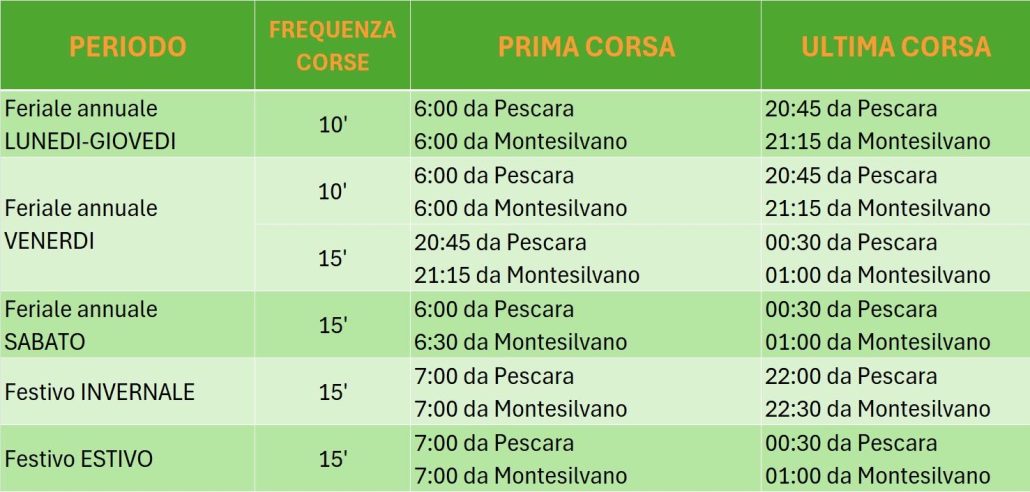 Nel nuovo assetto, dal lunedì al giovedì resta la frequenza di una corsa ogni 10 minuti, con prima partenza alle 6:00 da entrambe le città e ultime corse alle 20:45 da Pescara e alle 21:15 da Montesilvano. Il venerdì il servizio mantiene la stessa frequenza fino alle 20:45 e 21:15, poi passa a 15 minuti nelle ore serali e notturne, con prolungamento fino alle 00:30 da Pescara e all’1:00 da Montesilvano. Il sabato le corse sono ogni 15 minuti, con prima partenza alle 6:00 da Pescara e alle 6:30 da Montesilvano e ultime corse confermate alle 00:30 e all’1:00.