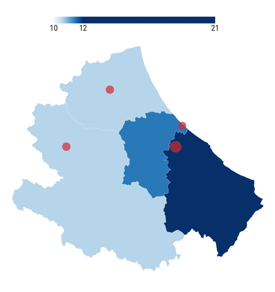 Chieti si attesta al di sopra della media nazionale in entrambi gli indicatori: il 74,1% dei cittadini non ha una stazione entro 3 chilometri e il 52,8% entro 5. Poco sotto Teramo con rispettivamente 48,8% e 33,9%. Nelle province dell’Aquila e di Pescara invece le stazioni risultano più vicine (in termini di chilometri) rispetto alla media italiana. (mappa)