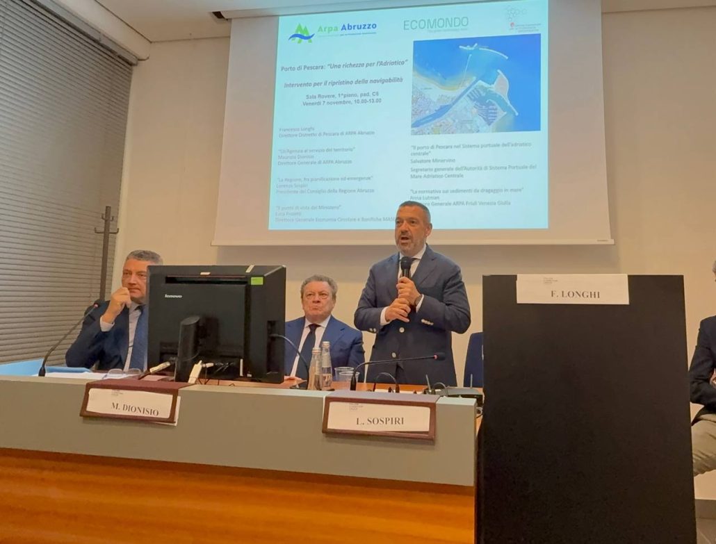 “E’ stata l’occasione – ha spiegato Sospiri – per portare l’esempio virtuoso rappresentato delle procedure che stiamo attuando per affrontare l’emergenza del dragaggio di Pescara, ovvero come trattare in banchina i fanghi da escavo portuali, analizzarli per poi poterli riutilizzare una volta che sono state effettuate le prime procedure di decontaminazione. Il processo che stiamo sperimentando, e continueremo nelle prossime settimane, che porterà a un aumento della capacità di fondale del porto di Pescara, può aprire una nuova strada per rendere più compatibile il costo, enorme, necessario per i dragaggi degli scali portuali regionali e nazionali. Questo permetterà di garantire una maggiore sicurezza per chi lo utilizza, in particolare la marineria, e un conseguente incremento della capacità di funzionamento”. “L’Abruzzo ha dimostrato anche a Ecomondo di essere una regione all’avanguardia – ha sottolineato Sospiri – con dirigenti e funzionari che sono all’altezza di sfide molto complicate come quella rappresentata dal dragaggio del porto di Pescara”.