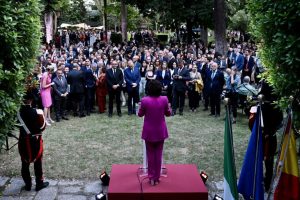 “Questa Festa della Repubblica è dedicata all’Abruzzo”, ha detto l’Ambasciatore in un passaggio del suo discorso pronunciato davanti ad un opera di Cascella, e cita d’Annunzio e Ovidio. Poi fa un ringraziamento allo storico e direttore del Festival dannunziano, Giordano Bruno Guerri, “sommo conoscitore della poetica e della storia del Vate”.