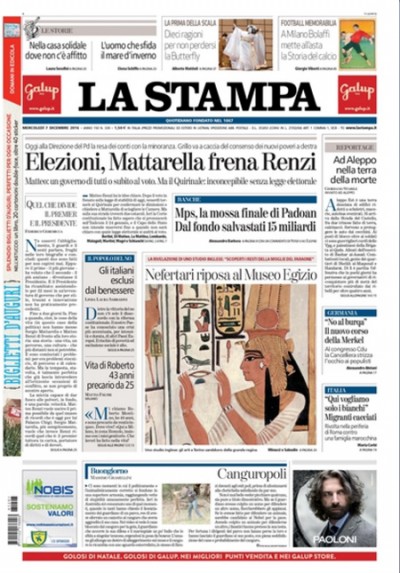 La situazione politica italiana è in apertura su tutti i principali quotidiani. Si sbizzariscono in le ricostruzioni di quasi tutti i giornali l’intenzione di Renzi di andare subito a elezioni anticipate sarebbe bloccata dal presidente della Repubblica Mattarella, che vorrebbe un governo che si occupi di far approvare una nuova legge elettorale. I quotidiani sportivi titolano sulla vittoria del Napoli, che si qualifica agli ottavi di Champions League battendo a Lisbona il Benfica.
