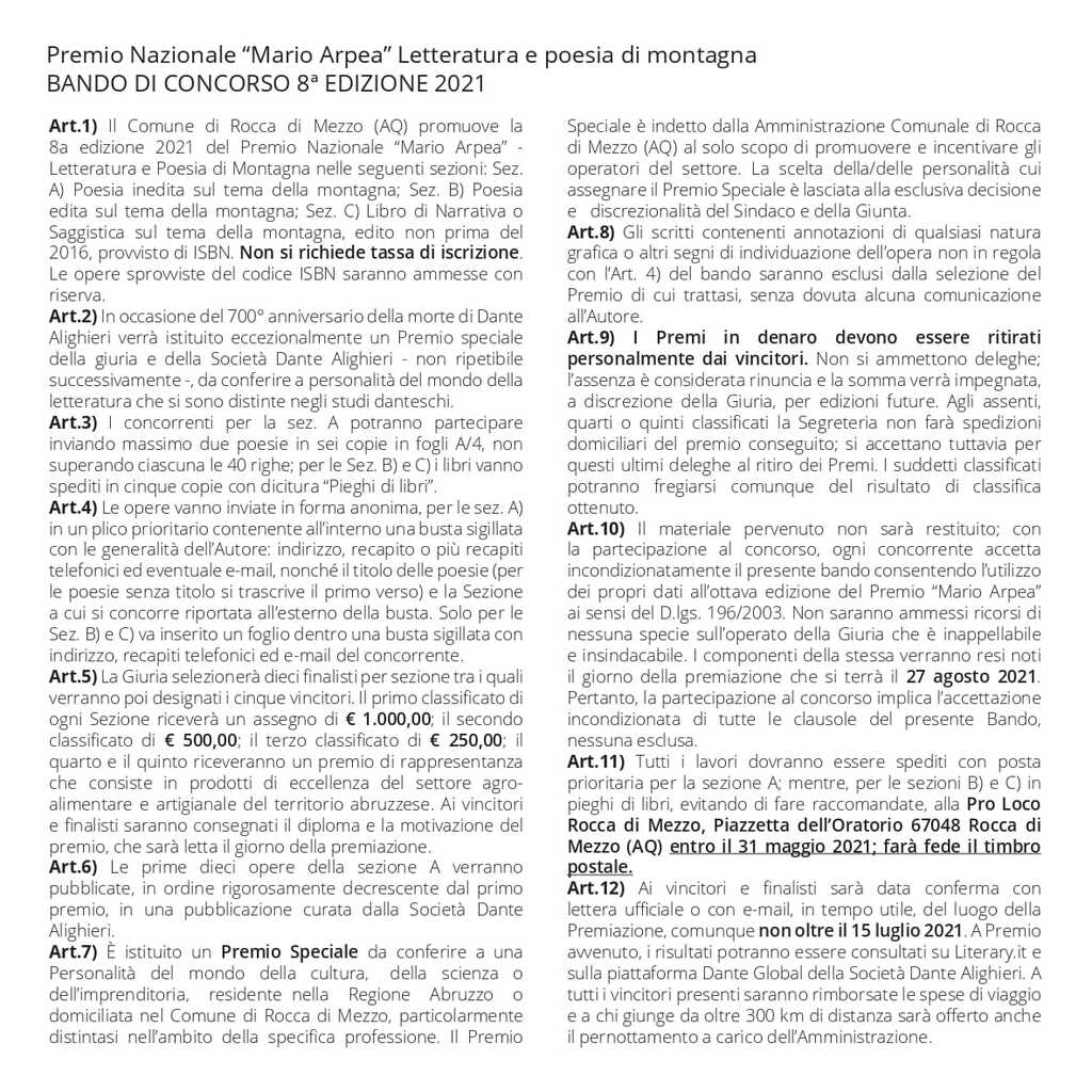 Nel cuore del Parco Naturale Regionale Sirente Velino, in un perfetto connubio tra natura e cultura, il 27 agosto 2021 si svolgerà l’ottava edizione del “Premio Nazionale Mario Arpea – Letteratura e Poesia di Montagna”. Quest’anno, in occasione del 700° anniversario della morte di Dante Alighieri, oltre ai premi destinati ai vincitori del concorso, verrà istituito eccezionalmente un premio speciale della giuria e della “Società Dante Alighieri”, da conferire a personalità del mondo della letteratura distintesi negli studi danteschi.