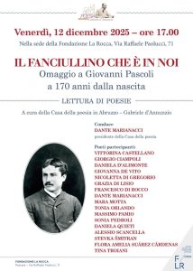 Venerdì, 12 dicembre, alle ore 17.00, alla Fondazione La Rocca di Pescara (via Raffaele Paolucci, 71), si terrà l’evento “Il fanciullino che è in noi”, un omaggio al poeta Giovanni Pascoli a 170 anni dalla nascita, organizzato dalla Casa della poesia in Abruzzo – Gabriele d’Annunzio. Nel corso della manifestazione, coordinata dal presidente della Casa della poesia, Dante Marianacci, i diciassette poeti partecipanti leggeranno e commenteranno un loro breve componimento, edito o inedito, liberamente ispirato alla poetica del fanciullino espressa da Pascoli nel 1897, in cui tra l’altro sostiene che “è dentro di noi un fanciullino che non solo ha brividi, come credeva Cebes Tebano che primo in sé lo scoperse, ma lagrime ancora e tripudi suoi”.