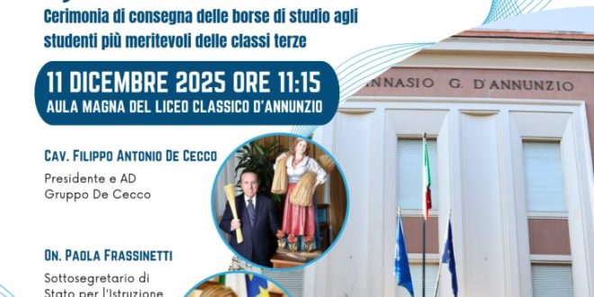 Si svolgerà giovedì 11 dicembre 2025 alle ore 11:15 nell’Aula Magna del Liceo Classico “G. d’Annunzio”, la Cerimonia di consegna di 11 borse di studio destinate agli studenti più meritevoli delle classi terze, nell’ambito dell’incontro “L’eccellenza del pensiero critico e creativo – I protagonisti del Liceo Classico”. Le borse di …