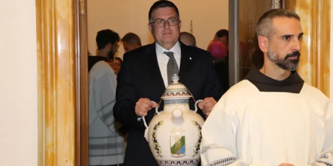 Due anfore in ceramica realizzate con tecniche tradizionali aquilane, il dono di 250 litri di olio extravergine di oliva, l’impegno per il restauro della loggetta della Basilica di Santa Maria degli Angeli e il recupero di due dipinti settecenteschi raffiguranti San Francesco e Santa Chiara. Donate anche eccellenze dell’agroalimentare abruzzese …
